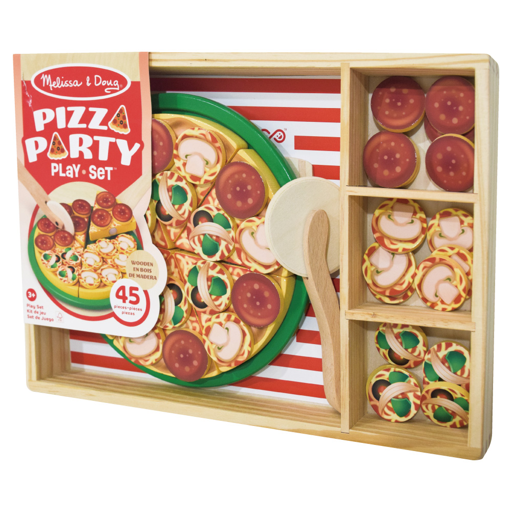木でできたピザ生地にペパロニやマッシュルームをトッピングしてピザが作れます。完成したらピザカッターでカット!